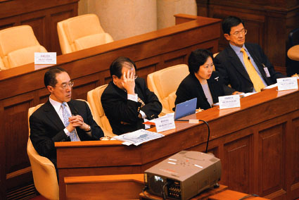 王錫基說電訊網絡擠塞是因為巿民不會使用電話,引起議員不滿。(本報記者 劉國權攝)