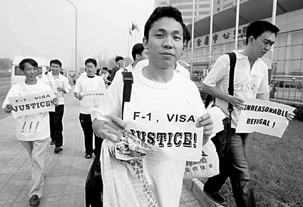 上午八點多,他們在北京國際科技展覽中心門前站成一排,身穿寫著「F-1 VISA JUSTICE」、「WE ONLY WANT STUDY」、「UNREASONABLE REFUSAL」等英文標語的白色T恤衫,等待著到此參加一個中美教育研討會的美國教育部官員。