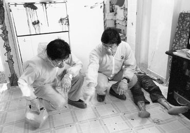化驗師小心觀察在兇案現場每一滴血點,尋找破案的線索。