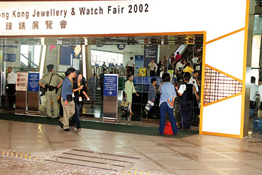 今年的珠寶展如常在會展新翼舉行,入場人士均需登記及申請訪客證,展覽場內均設有閉路電視,保安員亦持有雷鳴登鳥槍守衛。