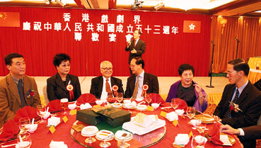 【本報訊】香港戲劇界人士為慶祝中華人民共和國成立五十三周年昨晚在灣仔新光酒樓舉行聯歡晚宴。出席宴會的嘉賓有戲劇界籌備委員會名譽主席陳廷驊,特區政府中央政策組顧問曾德成,中聯辦宣傳文體部副部長平力瑋,康樂及文化署助理署長鍾嶺海,香港八和會館主席陳劍聲,香港戲劇協會會長鍾景輝,京戲名票李和聲、馬長禮,藝術發展局主席陳達文,演藝學院院長盧景文,香港藝術節協會總監吳球,粵劇紅伶陳笑風、梁漢威,話劇編導朱克、杜國威等,共五百人出席了聯歡晚宴。