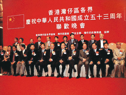 【本報訊】(記者 施立偉)香港灣仔區各界昨晚假座展覽中心舉行慶祝祖國成立五十三周年聯歡宴會,應邀出席的有,中央政府駐港聯絡辦副主任王鳳超、立法會議員曾鈺成及葉國謙、灣仔民政事務專員黃寶蓮、灣仔警區指揮官李紹堅總警司、灣仔區議會康樂及文化事務委員會黃漢清區議員以及社團領袖、街坊代表等近千人,賓主歡聚一堂,場面熱鬧。