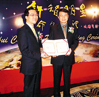 許智明(左)接受「許智明星」正式命名證書。