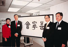 (左起)蕭孫郁標、張正甫、梁智鴻及王紹強於國學大師饒宗頤親題「善寧會」會徽前合影。