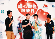 由香港心臟專科學院主辦的護心健體同樂日舉行當天,院長高德謙醫生在台上與影視紅星薛家燕小姐暢談護心之道。