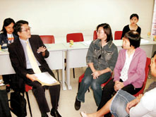 潘兆平(左)與參加保姆課程的學員交談。
