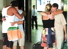 在大爆炸逃過大難的澳洲遊客在峇里機場與親人互相安慰擁抱。 (路透社)