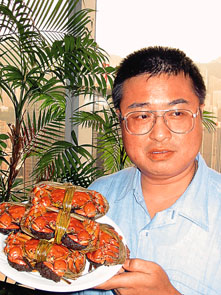 成隆行董事長蔡琪展示太湖大閘蟹,他正同江蘇省洽談定點銷售權。