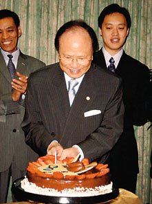 生日蛋糕上特別用朱古力仿製的鮑魚以祝賀「一哥」七十大壽,令「一哥」十分開心。 (莊海源攝)