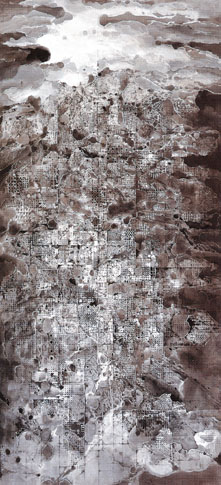 近作《城夢》系列,以重重疊疊的意象,把分割再拼合的空間,顯示迷失的夢者,畫家同時也是夢中的夢者。他的作品讓我們感悟到——城市人面對大眾文化的泛濫,呼吸受污染的空氣,每日在高廈的縫隙中穿行,與大自然日益疏離,遭受各種的壓力,度過多少無眠的晚上。城市人的夢,就只是白日夢。
