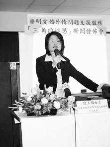 明愛家庭服務婚外情問題支援服務主任陳玉梅表示,該會由二○○一年一月至二○○二年九月期間,共收到四十八位「第三者」的求助個案,全部都是女性,有四成五都是介乎於三十五至四十四歲,三成七未婚,至於已婚的,有三成三的婚齡是一年以下,八成半是職業女性,有六成以上的婚外情都是維持一年以上。陳玉梅表示,她們求助的原因,主要是受到情緒困擾,擔心子女學業及將來婚姻觀念以及糾纏在三角關係中而苦惱難解。