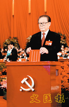 十四日上午,十六大代表投票選舉十六屆中央委員會委員、候補委員和中央紀律檢查委員會委員。這是江澤民投票。 (新華社)
