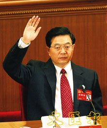 胡錦濤在十六大閉幕會上舉手表決一項決議。 (法新社)