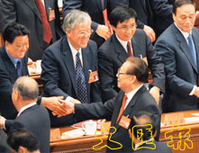 江澤民在十六大閉幕後與其他與會代表握手致意。 (美聯社)