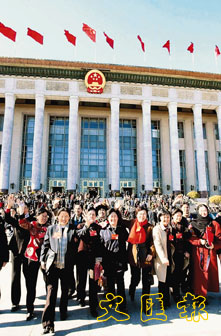 北京今晨大風猛起,寒氣逼人。但從七點起,人民大會堂台階上就陸續出現記者身影。隨後,這支隊伍不斷壯大,八時剛過,已有近百名中外記者雲集於此。果然天道酬勤,早到的記者沒有因新聞中心「九時半集合」的通知「誤導」而錯過代表入場,一心以為可以輕鬆進入大會堂的各地代表再次「遭遇」記者「圍攻」。