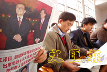 十六大閉幕、中共新領導層誕生成為十五日內地傳媒的特大新聞,並加以大幅報道。圖為北京火車站內候車的市民在聚精會神地看報。(美聯社)