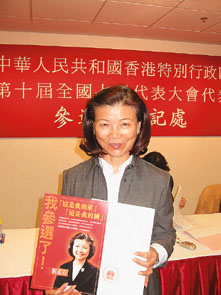 出名辦事認真的立法會議員劉柔芬,是次攜二百七十一份選舉委員的提名信,參選港區人大代表。像九六年參選臨時立法會議員一樣,她還印製了一份精美的宣傳單張,講述約五十年前,九歲的她怎樣隨母親離開汕頭,來港同父親團聚;當行程艱辛,前路茫茫時,劉母堅定鼓勵她說:「人,即使一無所有,只要有意志,路便可以走下去。我們有一張通行證,一些乾糧,還有一雙手,還有什麼事做不來的?」