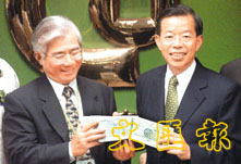 高雄市長謝長廷(右)五日北上查帳,除前往合作金庫城東分行調閱當年支票正本外,並與合庫總經理鍾利雄(左)一起展示支票。(中央社)