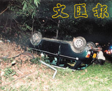 【本報訊】昨日凌晨二時十五分,一名陳姓休班女警駕駛MINI COOPER小轎車返柴灣家途中,在東區走廊近杏花h對開一個右轉彎位時,失控剷上路邊草坪,撞毀路牌後翻轉,四輪朝天,她右膝受輕傷爬出車外,報警送院。