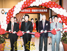 遠東航空公司三日以包機方式首航韓國濟州島,由中正航空站主任王德和 (左起)、民進黨前主席施明德、遠東航空總經理陳每文、韓國觀光公社社長杉忠敬剪綵。 (中央社)