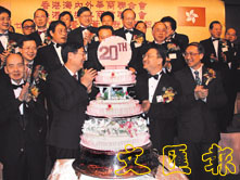【本報訊】(記者 鄭群)香港海內外華商聯合會、香港觀塘工商業聯合會昨晚假尖沙咀洲際酒店宴會廳喜迎二十歲生日,來自本港、美國、加拿大、台灣及中國內地各省市的商界友好近千人聚首一堂共賀喜慶。