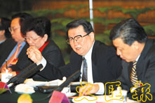 中共中央政治局常委李長春八日在北京人民大會堂同出席全國宣傳部長會議的代表座談。 (新華社)