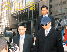 前神父被控性侵犯案,法官拒絕辯方終止聆訊申請。圖為被告劉嘉兒(戴帽者)及代表律師鍾偉強(後)步出法庭。(陸智豪攝)