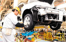 天津豐田汽車有限公司工人在「威馳」組裝車間安裝車輪。由日本豐田汽車公司與中國天津一汽夏利汽車公司合資生產的「威馳」轎車,深受購車族青睞。(資料圖片)