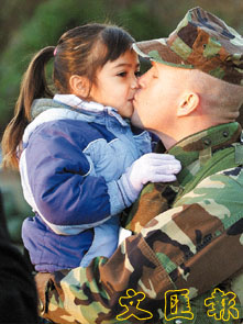 一名美國海軍陸戰隊中尉周六在北卡羅來納州的莫爾黑德港口上船前,親吻五歲大的女兒。他被派赴中東一秘密地點。 (路透社)