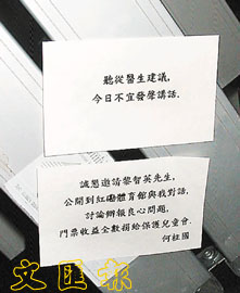 何柱國昨晚出席香港癌症基金會二○○三慈善晚會,由於現場除了港聞記者外,尚有娛樂、名人等版面的記者採訪,故何柱國一度被超過五十名記者及攝影師包圍,情況一度混亂;大家最關心他對黎氏的批評,何柱國卻不發一言,只頻頻揮手表示自己不適。但原來何柱國今次可謂有備而戰:對於何時與黎智英對話,何氏當即在站得最近記者的筆記本上寫上「anytime」(任何時間),大有「隨時奉陪」的濃厚火藥味;何柱國隨後向記者派早已備好的兩款咭片,其中一張大意為昨天抱病不宜講話;另一張卻赫然是其向黎智英立下的戰書,全文如下: