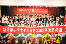 汕頭市賀新春訪問團昨日甫抵步,即在香港潮商學校舉行賀新春聯誼活動暨文藝演出。表演結束後,汕頭市市長李春洪、汕頭市人大副主任鄭開隆、市政協副主席謝惠鵬、香港潮屬社團總會主席陳偉南、香港潮州商會會長蔡衍濤等與一群演出的中小學生合照。