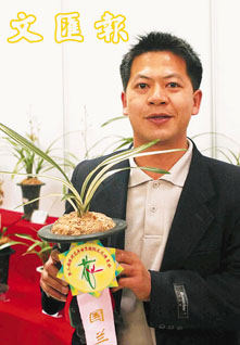 二十一日,廣東省佛山市順德區陳村青年辛釗華在花展上手捧由他自己培植的蘭花,這盆蘭花獲得迎春國際蘭花展「國蘭」金獎。(新華社)