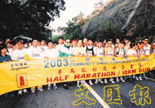 郭炳江(前左四)、張永銳(前左六)及李嘉士(前左五)主持於西貢北潭涌郊野公園舉行的「公益慈善馬拉松二○○三」起步儀式,為肢體傷殘人士籌款。