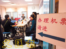 由於時間倉促,台灣六家航空公司擠在小小「斗室」內為乘客辦理包機定票手續。(本報上海傳真)
