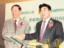 【本報訊】(記者 鄭群)新恆基國際物業管理有限公司與香港浸會大學附屬寰科顧問公司經過近一年的合作,成功研製開發了「環保廚餘處理機」並將它推向市場。昨日新恆基國際(集團)有限公司董事局主席高敬德與浸會大學校長吳清輝代表合作雙方,假浸會大學林護國際會議中心為成立「香港環保生物科技有限公司」主持簽約,這標誌著雙方在環保創新科技的合作將向更高層次和更深層次邁進。