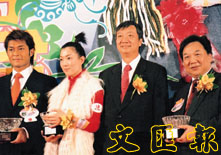 盈保主席袁天凡、行政總裁楊梵城致送紀念品予男、女主角古天樂及鄭秀文。