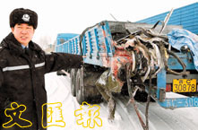 瀋陽─四平高速公路發生大巴撼貨車嚴重交通意外。圖為交警向記者指出碰撞點。(新華社)