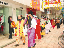 農曆羊年新年,南昌街頭出現新景,民間藝術組織——鵑花藝術團根據財神爺、八仙的傳說,到街頭店舖送財神、得紅包。店家和八仙一起開心。