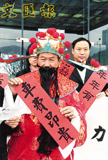 有公民力量代表扮財神,手持揮春,要求多間公共交通機構減票價。 (羅敬文攝)