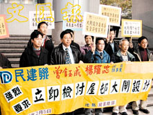 楊耀忠與民建聯成員及居民一同向房署請願, 要求檢討大閘設計。 (任智鵬攝)