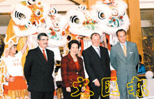 左起:太古地產董事及總經理高晉年、連卡佛(香港)總裁黃美卿、愛馬仕(大中華)董事總經理馮博鈞、屈臣氏食品、電子及百貨部行政總裁艾一帆,為醒獅點睛後合攝。(張偉民 攝)