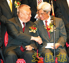 於福建社團新春酒會上,董建華與福建社團聯會執行主席李群華握手。 (劉國權攝)