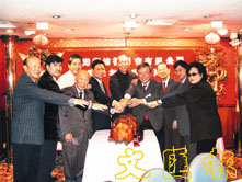 陳冠成主席等賓主於新春酒會上切燒豬慶賀。 (鄭群攝)