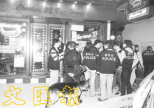 另一方面,新界北重案組十多名探員,在十數名機動部隊人員及一頭警犬協助下,前晚深夜掩至元朗西菁街及安寧路一帶的酒吧及夜店查牌,至昨晨零時許,在西菁街一家酒吧帶走兩男女。該名青年被探員押走時,見記者到場拍攝,竟作勢衝向記者施襲,但為探員阻止。