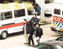 探員正將扑頭集團其中一名疑犯蒙頭帶回警署扣查。