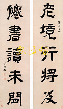 圖為清代著名書畫家王時敏的隸書楹聯,字體佈局穩健,用筆與風格表露無遺矣。