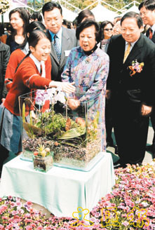 董太在香港花卉展聽學生介紹展品,何志平亦被靚花吸引。 (李志樑攝)
