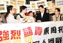 02.11.03 演藝界及其他團體於政府總部作聲討集會,女星劉嘉玲挺身而出,就事件開腔表態。楊受成道歉並決定停刊。