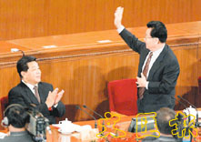 全國政協十屆一次會議第四次全體會議昨日舉行,會議選舉了新一屆政協領導層,李瑞環在選舉結果產生後,到會祝賀。左為新當選的政協主席賈慶林。(中新社)
