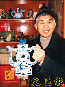 奉老手捧著他鍾愛的清代光緒年間「喜」字清花酒壺。(本報西南傳真)
